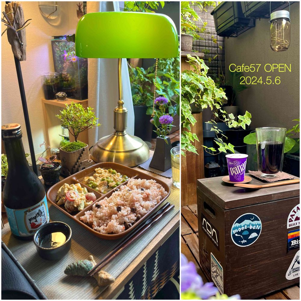 連休最終日 カフェ57 OPENしています🤗✨ 本日のランチメニューは父の作った豆を使って「ツタンカーメン豆のご飯・グリンピースの卵とじ・スナップエンドウのサラダ」です。お酒は徳島の「鳴門鯛」スッキリ香ります♪ そしてデザートはパナップブドウとコーヒー☕️ ベランダも室内もどちらもお楽しみを💚