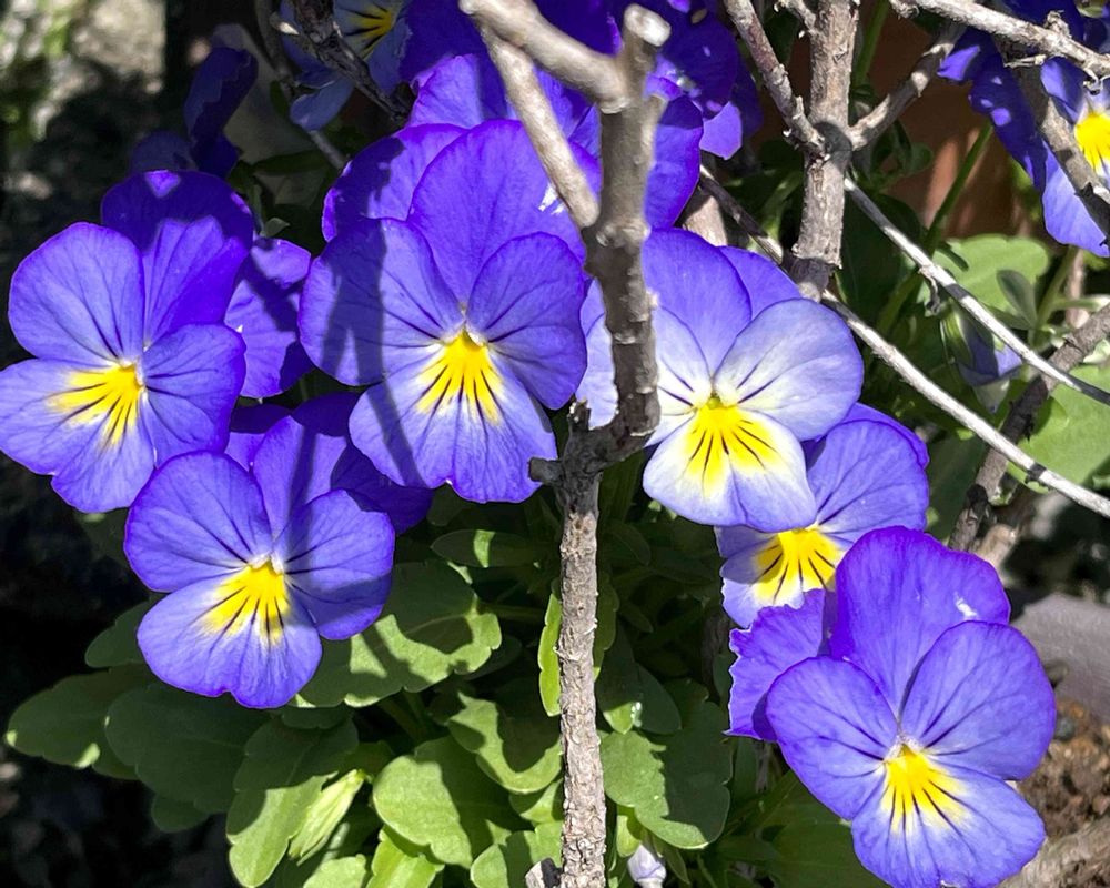 ② そのスカスカな株元に、こぼれ種のビオラが咲きました。枯れ枝に見えるのはブルーデージーの茎😅
