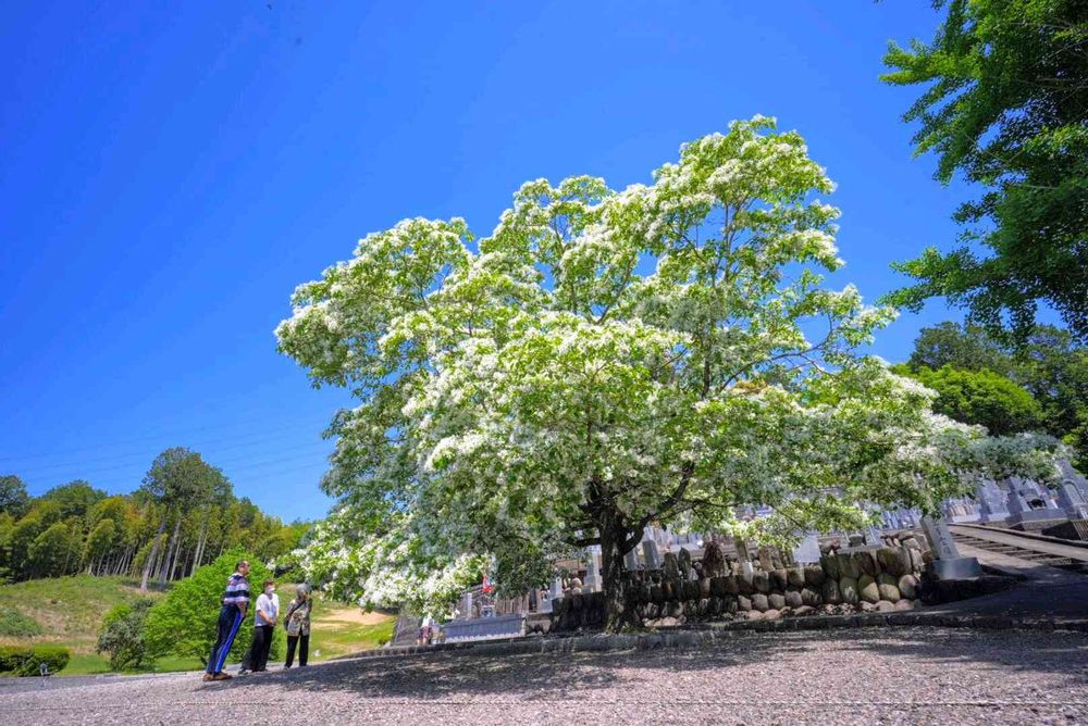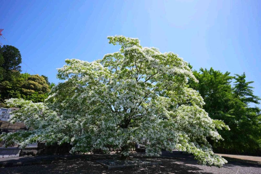 気持ちの良い青空に真っ白と黄緑色の葉っぱが入り混じったナンジャモンジャの木(ヒトツバタゴ)は爽快でした