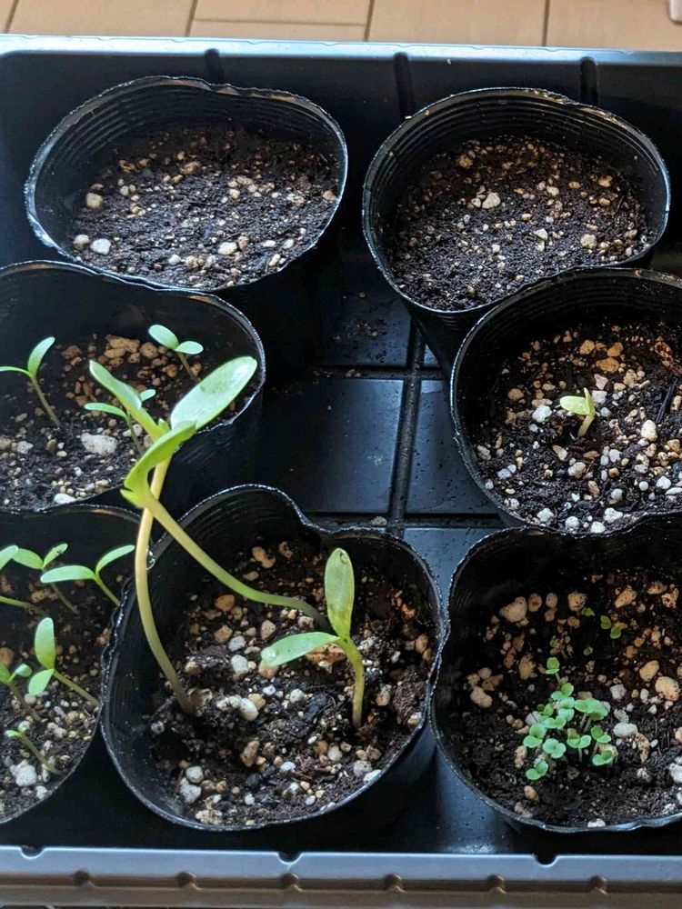 種から植えてる苗たち、マリーゴールド、ダイソーのひまわり、去年咲いたレモンバームの種から生えた芽。