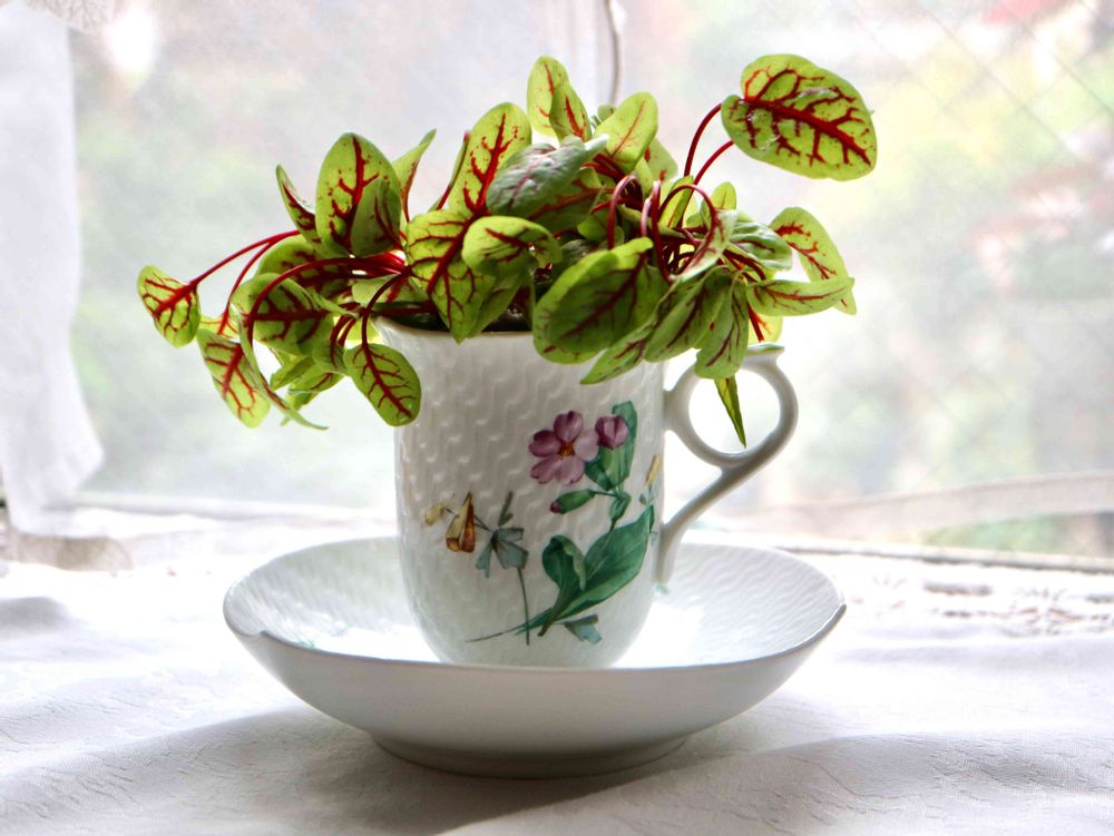 ワイルドな赤い葉脈サラダ菜とは思えずカップに飾って見ました、