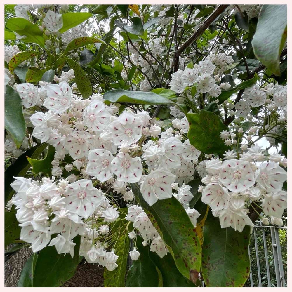 筑波実験植物園内にカルミア(アメリカシャクナゲ)が咲いてました♬HCで小さな苗木を見たことありますが〜こんなに大きな木は初めて〜これまたキレイどわわ〜😍🤍つぼみちゃんは金平糖かアポロチョコに見えますね😆♬