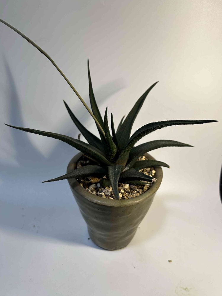 黒いハオルチア 開花。光当ててもブラックホールのように光を吸収しやがる。写り映えしない😅