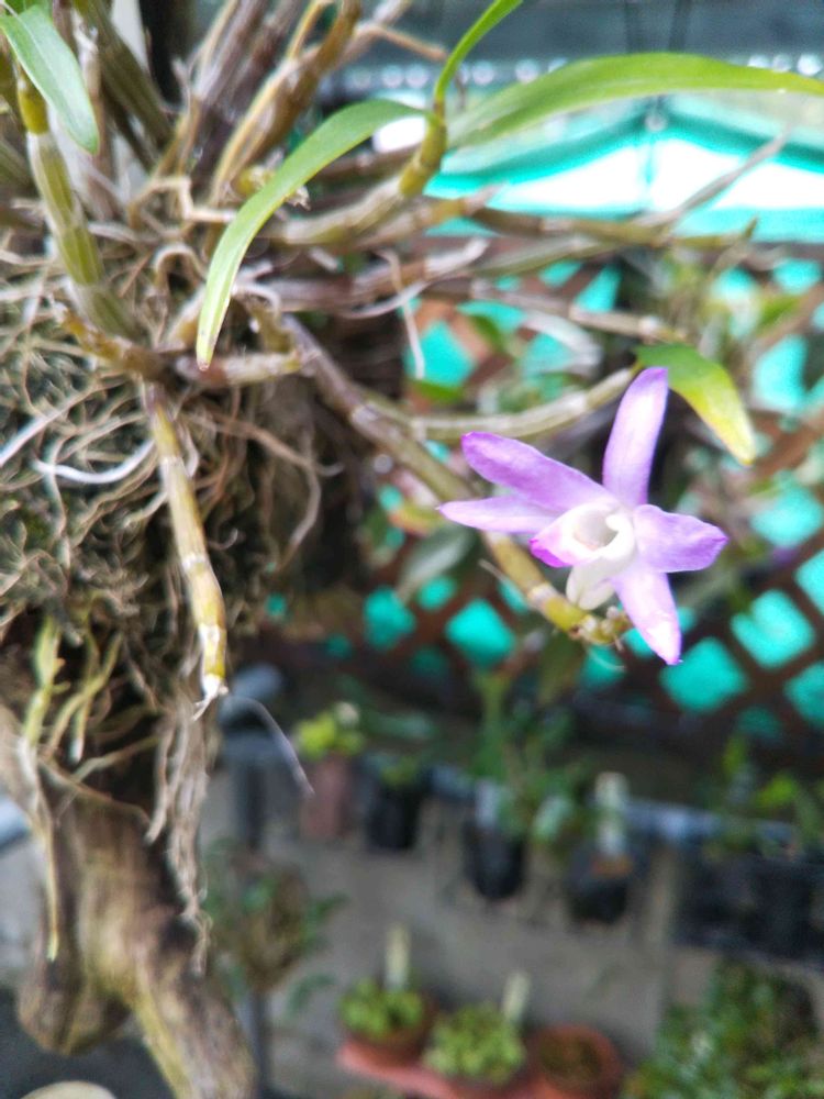 <地道投稿>おはようございます🌂流木仕様「セッコク 紅陵」 一輪ですが開花しました。肌寒い日にありがとう🎵
