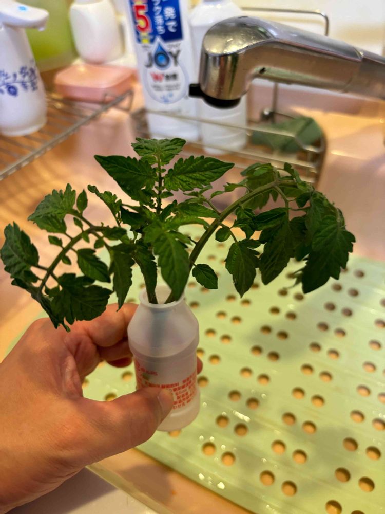帰ってきたら苗の主軸の枝が折れてた。花芽が下から上まで3箇所についていたのに😭2本仕立てにしてたから、もう1本枝が残っているから、そこからまた生やそう。悲しい