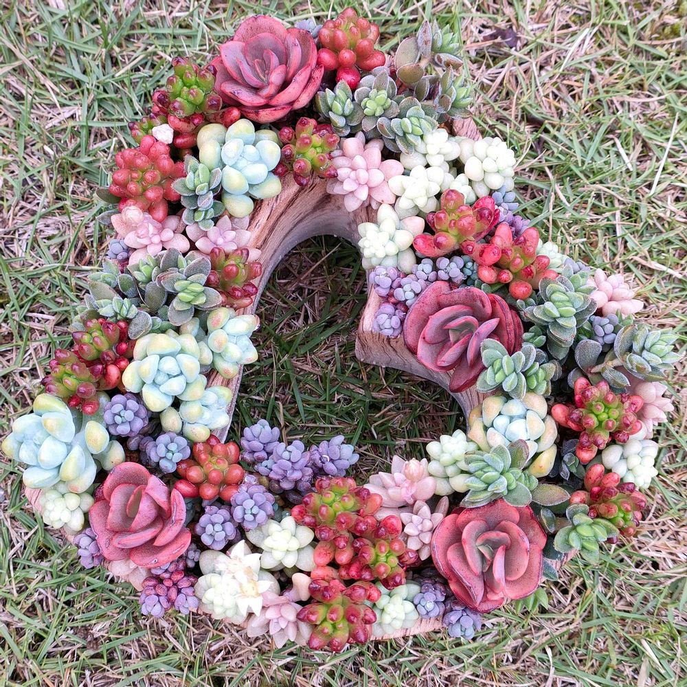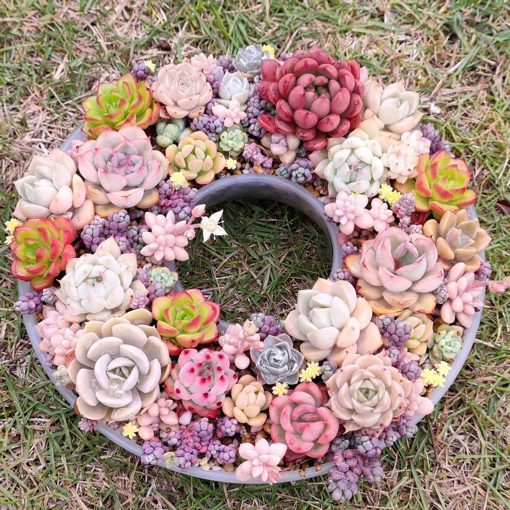 葉挿しっ子や子株を見つけては植え付けた寄せ集めのリース
