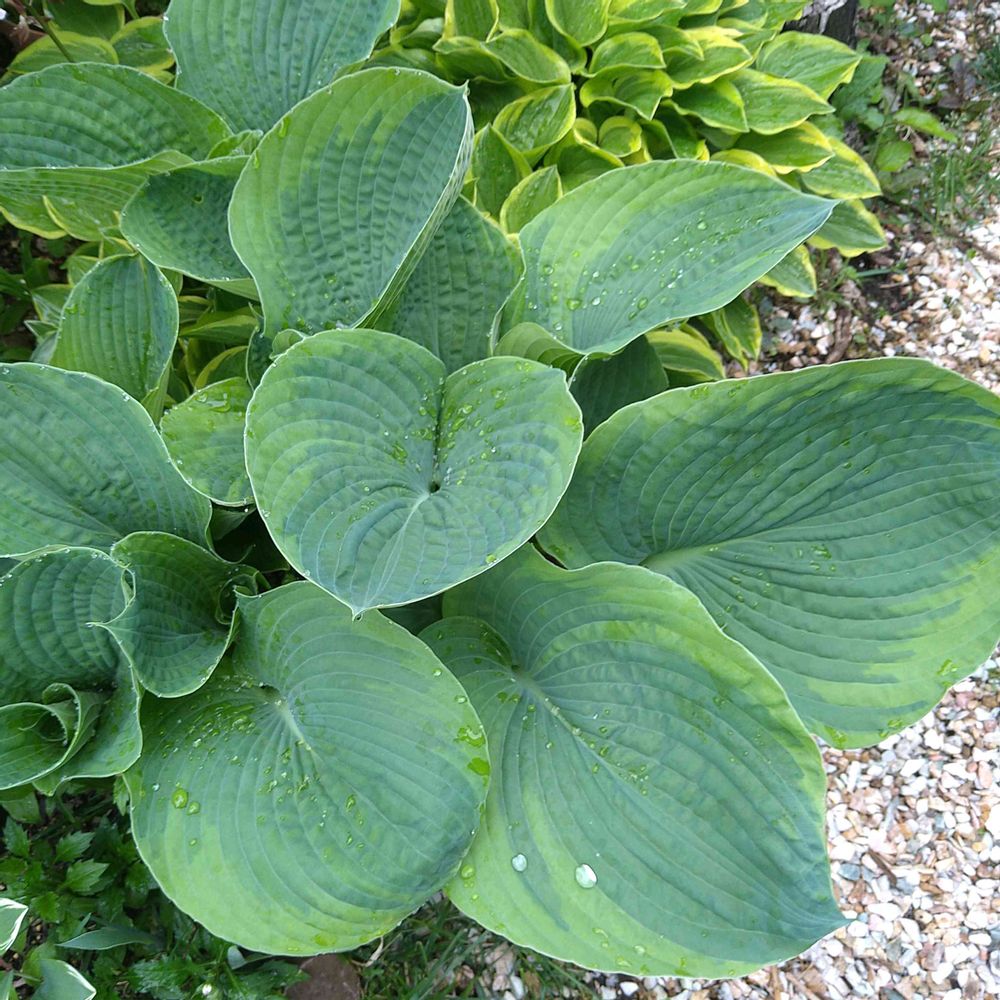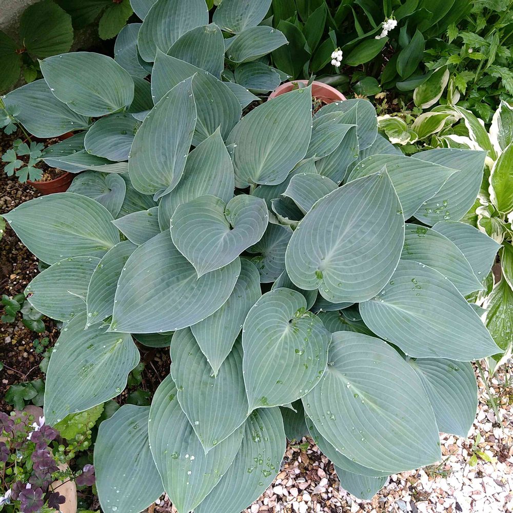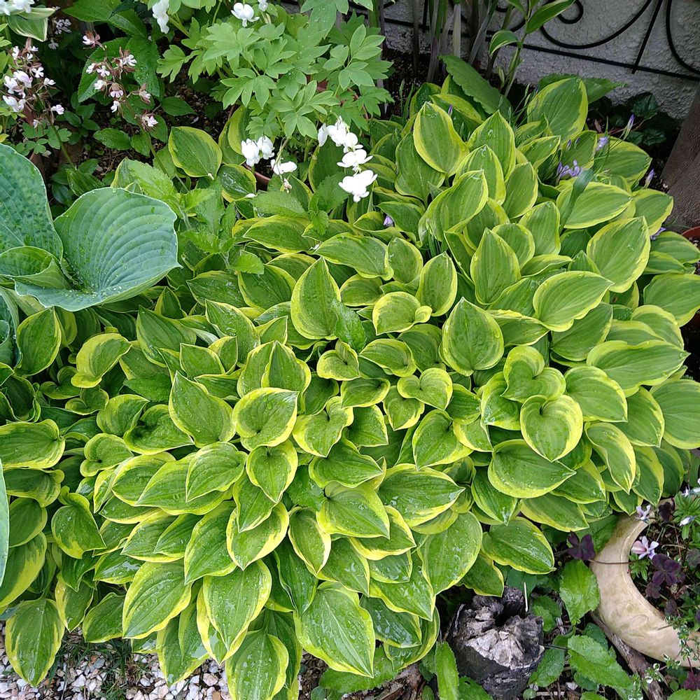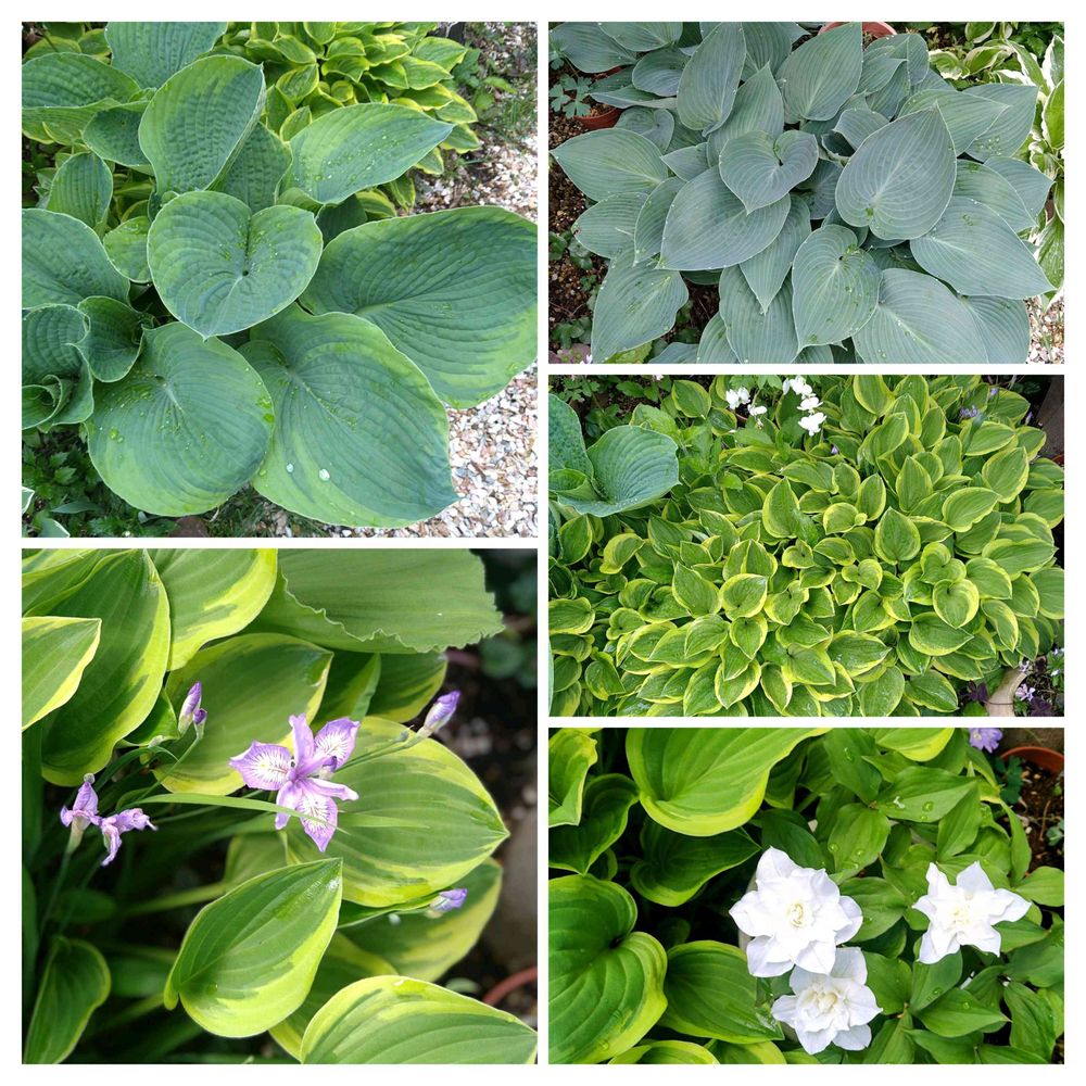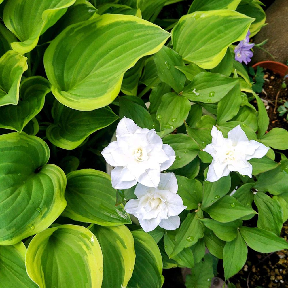 庭のギボウシたちとヒメシャガ、八重咲きエンレイソウ🌿🤍💜