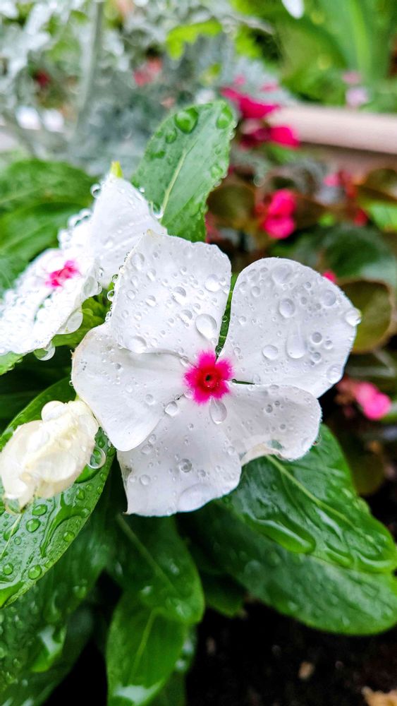 ③ニチニチソウ🤍🍃雨宿り出来なく大きな雨粒💧