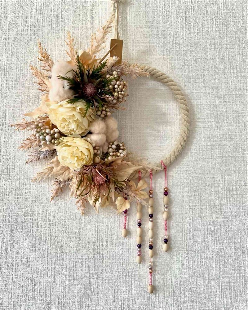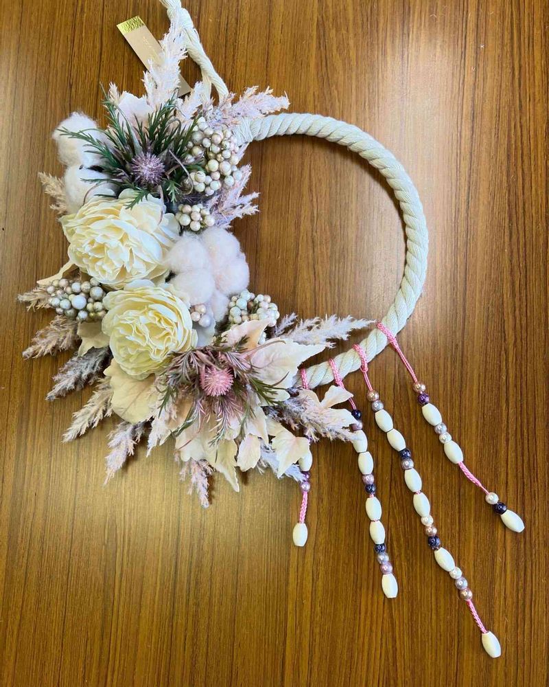 花材が盛りだくさんでバランスが難しかったです。 ドリームキッチャー風に作ってみましたよ。