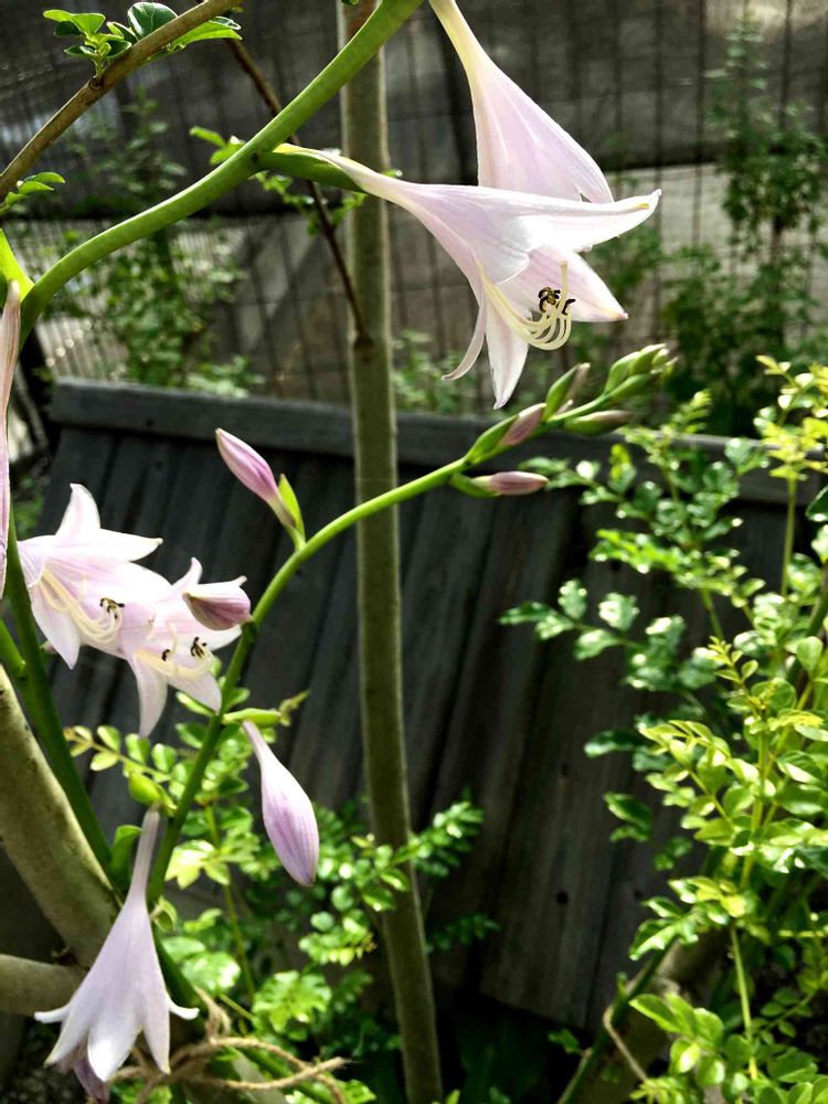 花茎が伸びすぎで、こんにちはしすぎるから、シマトネリコの樹に、麻紐で今朝くくりました。なので、写真も撮りやすい。ただ近隣が写るからあれこれ撮り直し(*^◯^*)