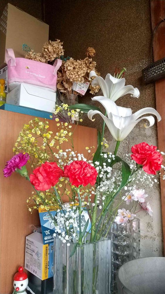 赤いカーネーション、白いカスミソウ、白いユリ、黄色いカスミソウの花が綺麗にたくさん咲いていました。