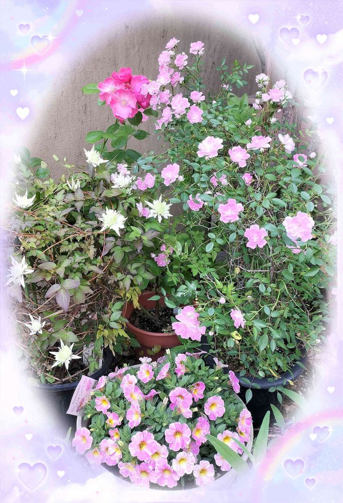 クリスマスローズの鉢を置いてた場所にアンジェラとつるバラとクレマチスとミリオンベルを置いて