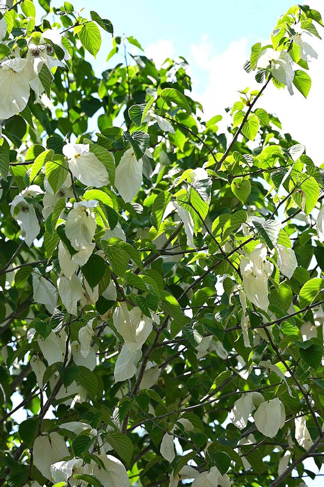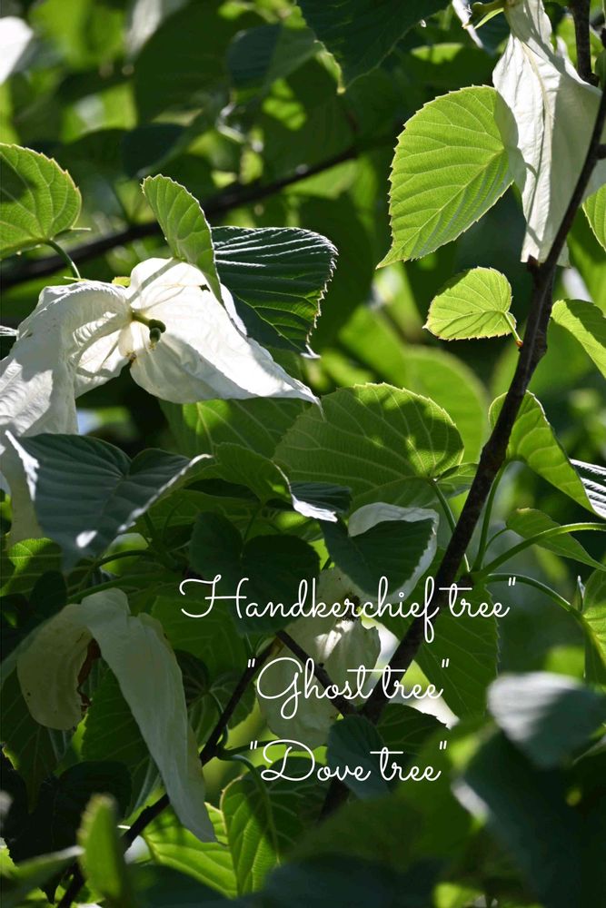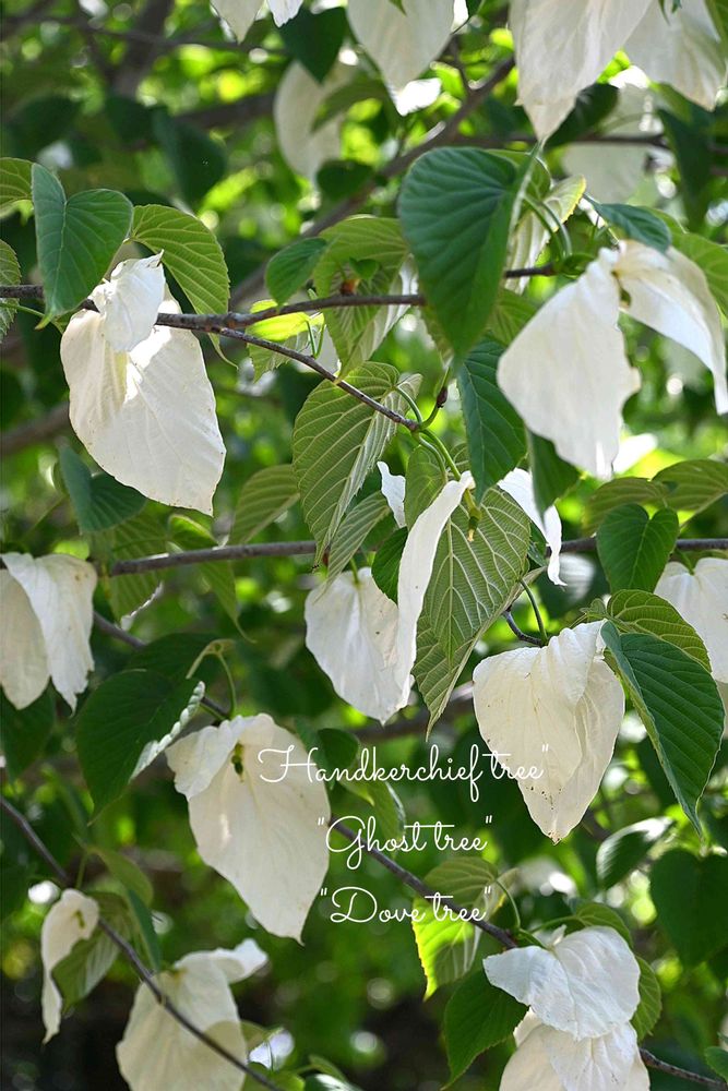 「ハンカチの木」という名は、白い2枚の苞がハンカチのように開いて揺れる様子から名づけられました。また、白いハトの群れがとまっているようにも見えるため、別名「ハトノキ」とも呼ばれます🕊