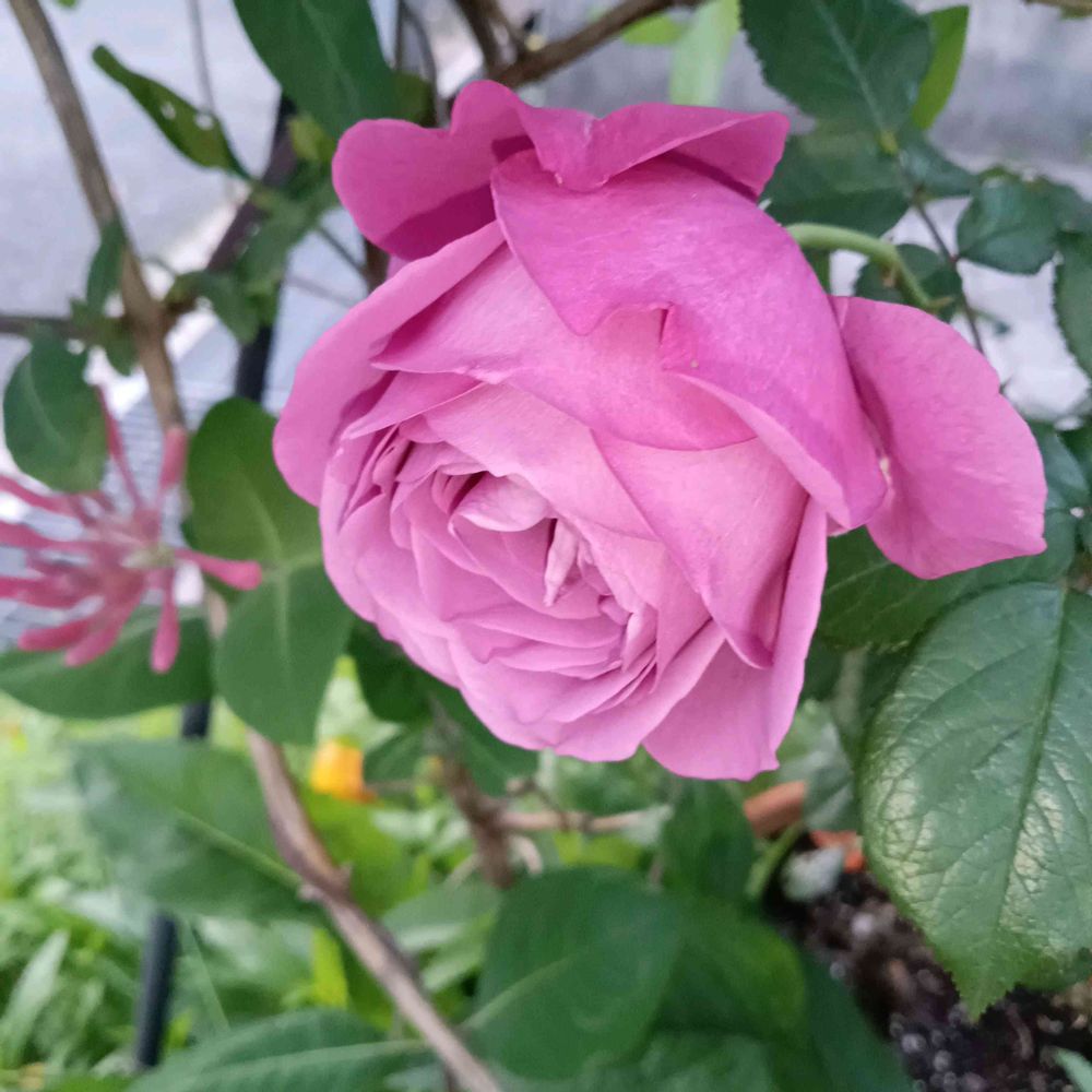 けっこう紫系統のバラでは強い品種らしく無農薬栽培のわが家でも生き残っているたくましいバラです。