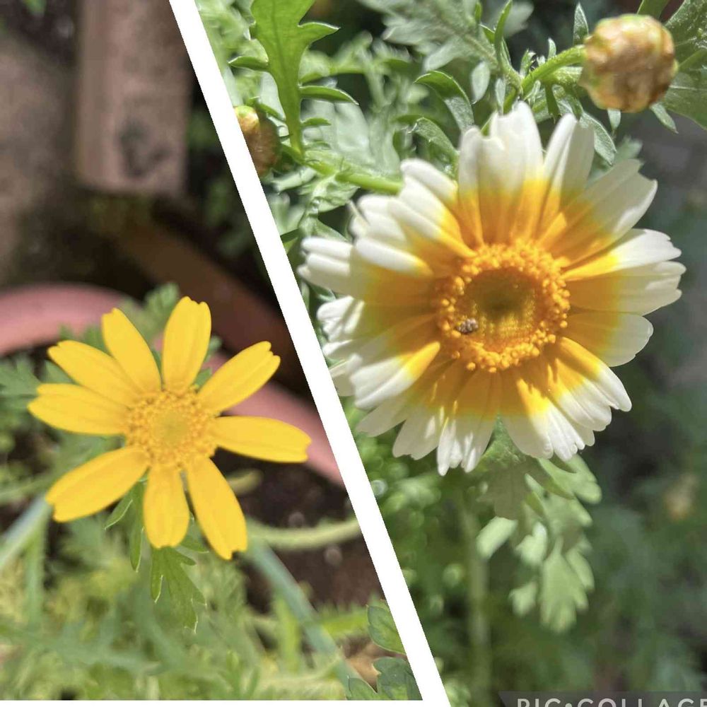 ①デッキで育てていた春菊のお花が咲きました。毎朝サラダに葉っぱを摘んでは、頂いてましたが、ついにお花が咲くまでになり、葉っぱも硬くなってきました。お野菜としての春菊は、終了です。お花可愛い😍