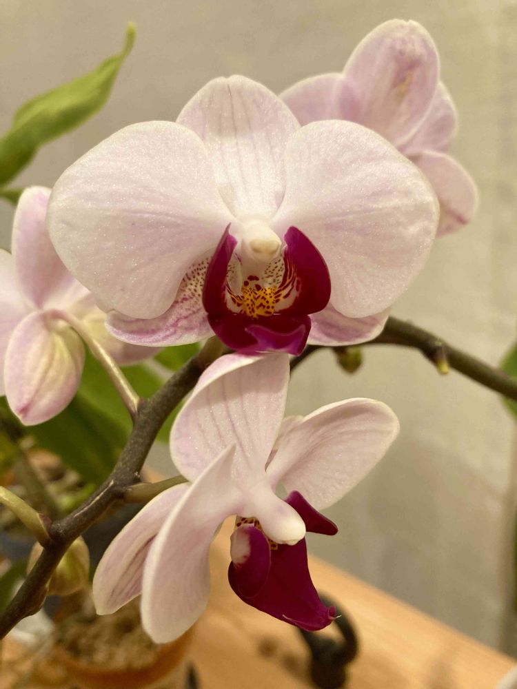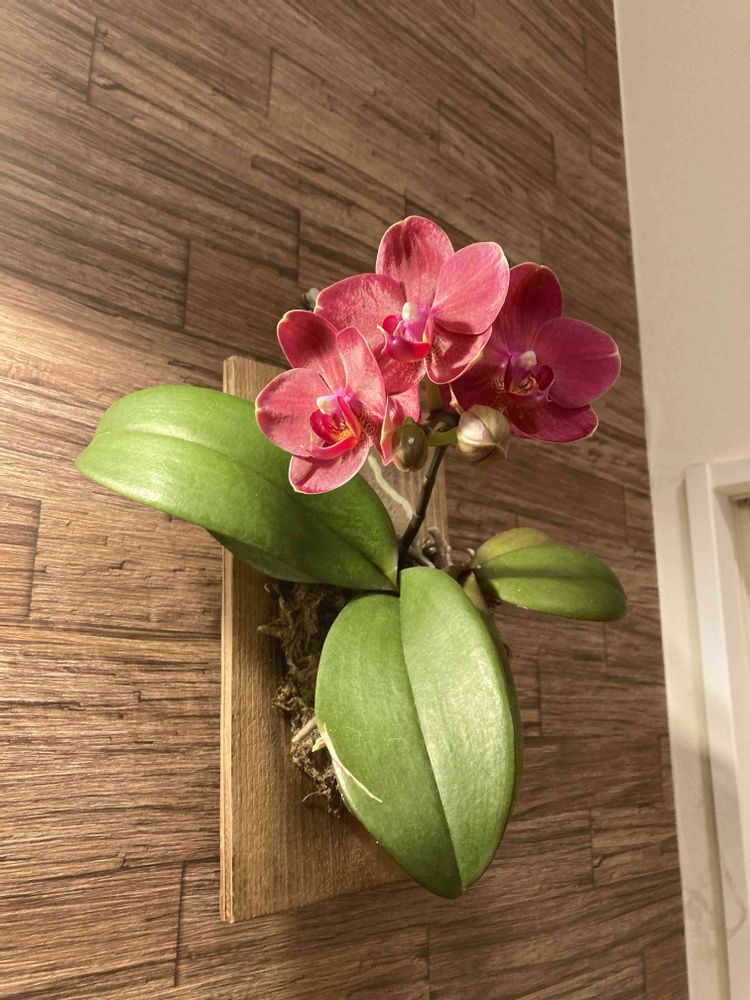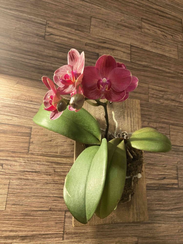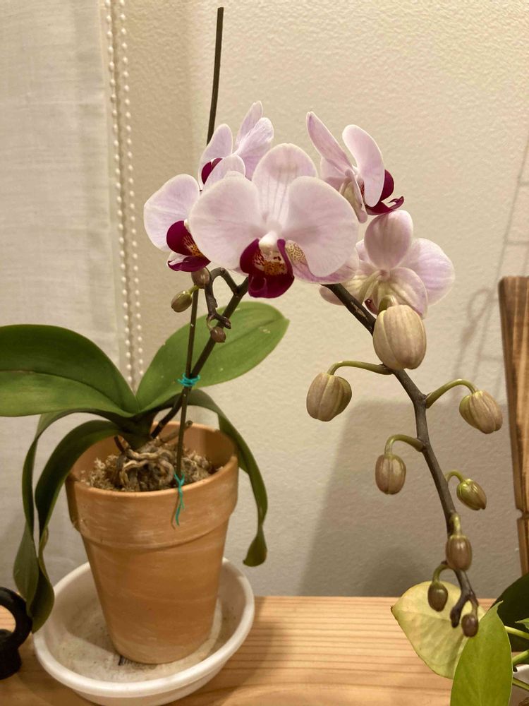 ピンクの胡蝶蘭は葉がすごく大きいけれど花はミディくらい🌸葉が大きいから花も大きいかも✨と葉っぱだけの時に期待して購入しましたが、花と葉は比例しないのね( ;∀;)