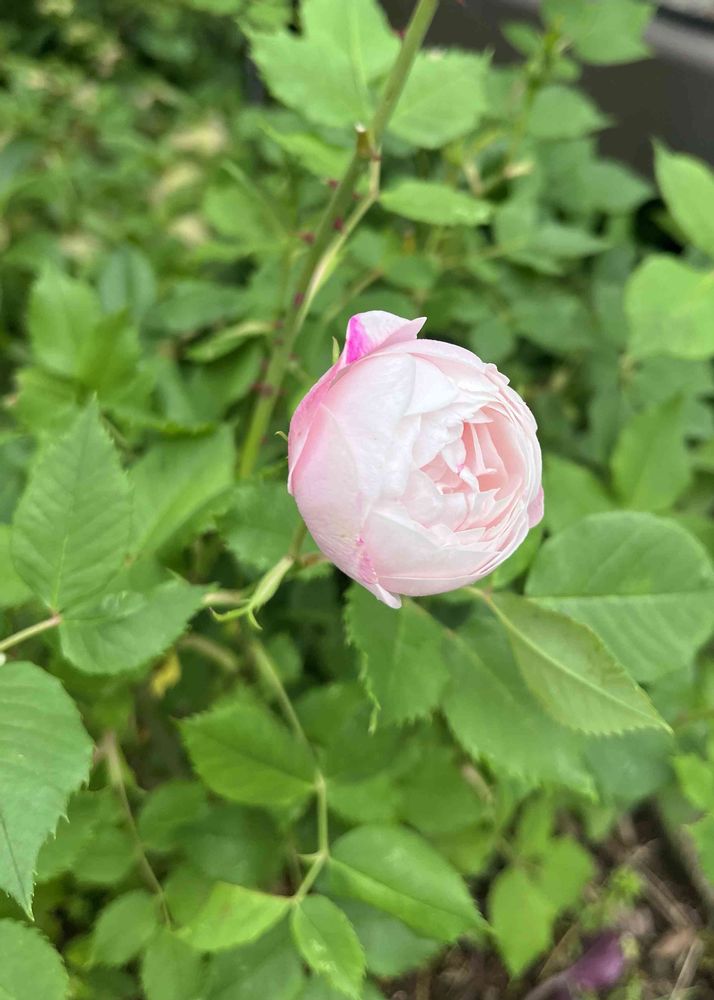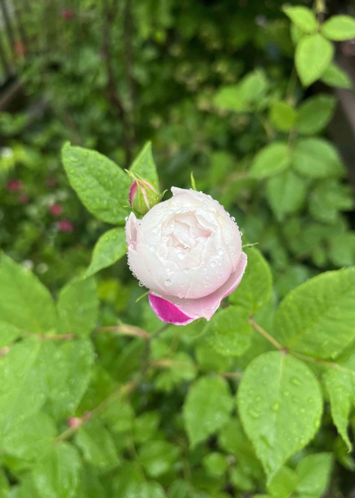 雨の中マダムピエールオジェが開花✨玉のような咲き方がたまらん。ピンクの縁取りもたまらん。