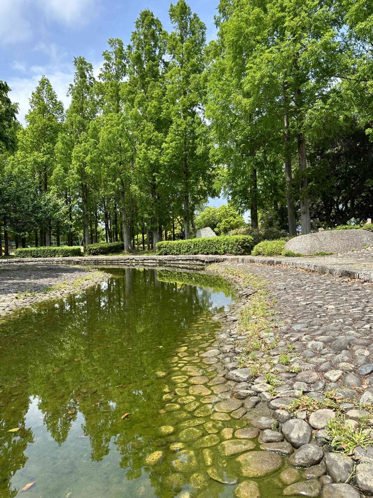 公園の中の水辺に映る若葉しげるメタセコイア。