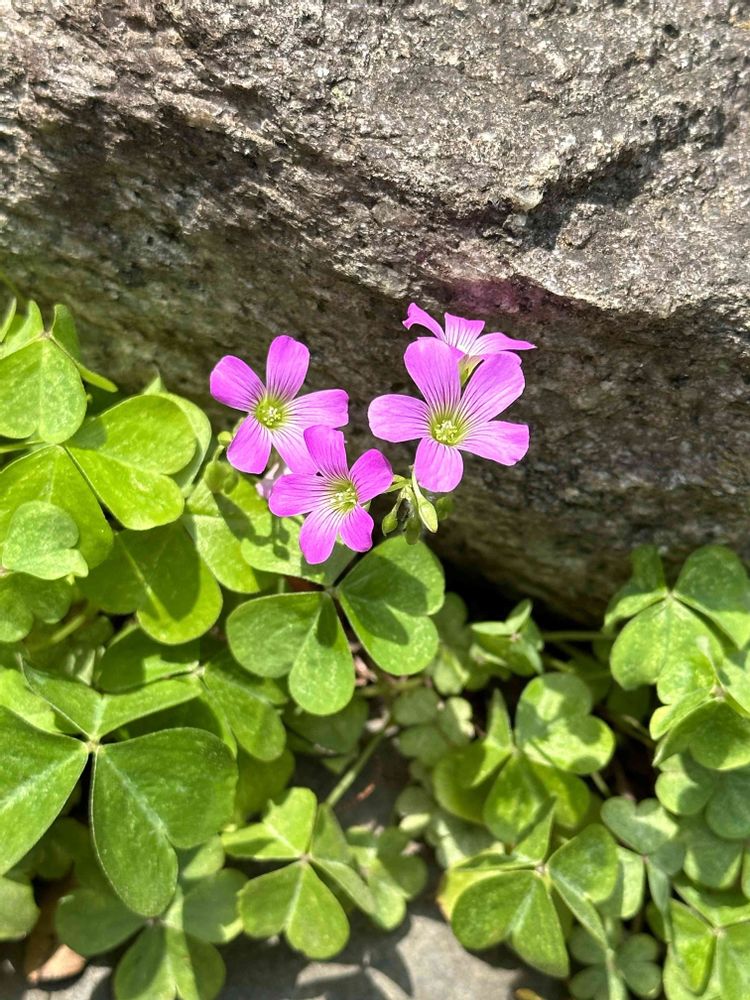 水辺にある岩の隙間から、可愛いピンクのお花はムラサキカタバミ