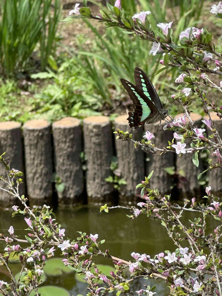 水辺に咲くハクチョウゲにアオスジアゲハがヒラヒラと舞う姿は水色模様が引きたって見惚れそうでした。