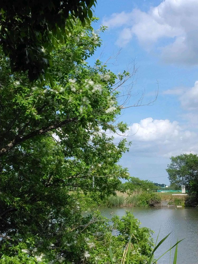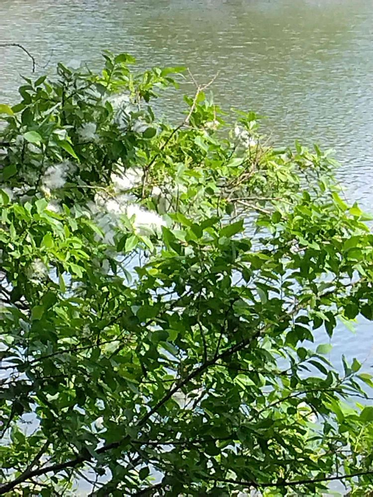 晴れた日の初夏の風に吹かれ、ふわふわ雪のように舞うものを追いかけて、この木に辿り着きました。Gで検索すると、「柳絮(リュウジョ)白い綿毛のついた柳の種子。又、それが春に飛び漂うこと」とありました。