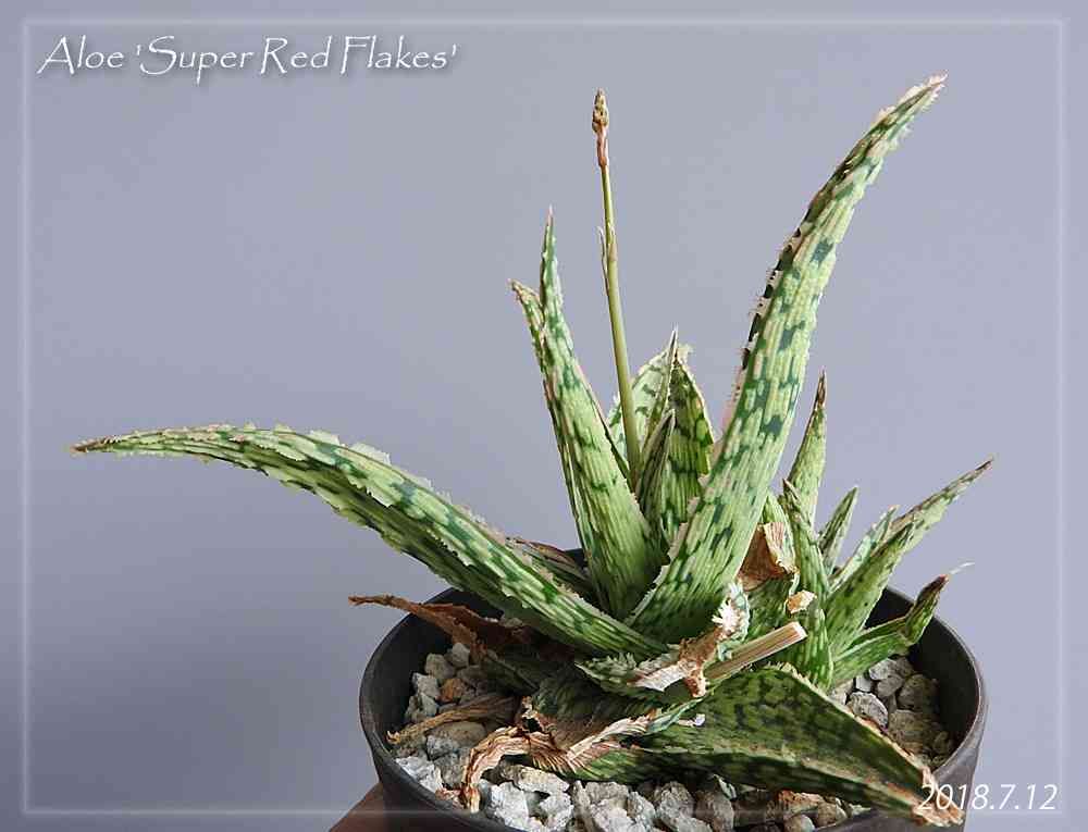 アロエ、スーパーレッドフレーク。レッドと言いつつこの時期は緑。冬の間にかなり葉を傷めてしまって株の姿が乱れてしまったけど、元気に仔吹きしてる。春の水やりを怠った製で花を咲かせてない多肉も多いのに、これは花芽をつけてる。去年も何回か花を咲かせたので、咲かせやすいタイプなのかも。