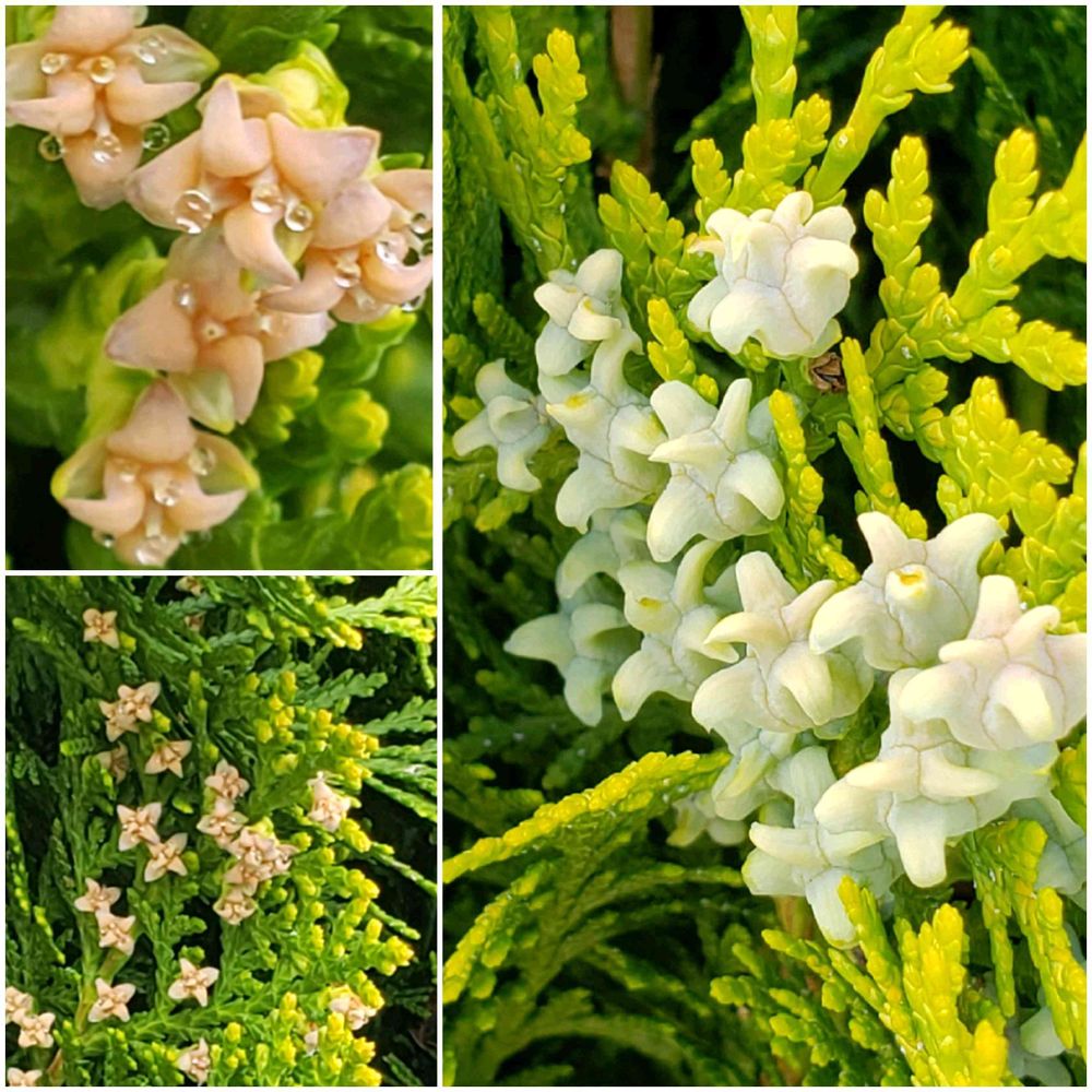コノテガシワ(児手柏)の花と未熟な果実。