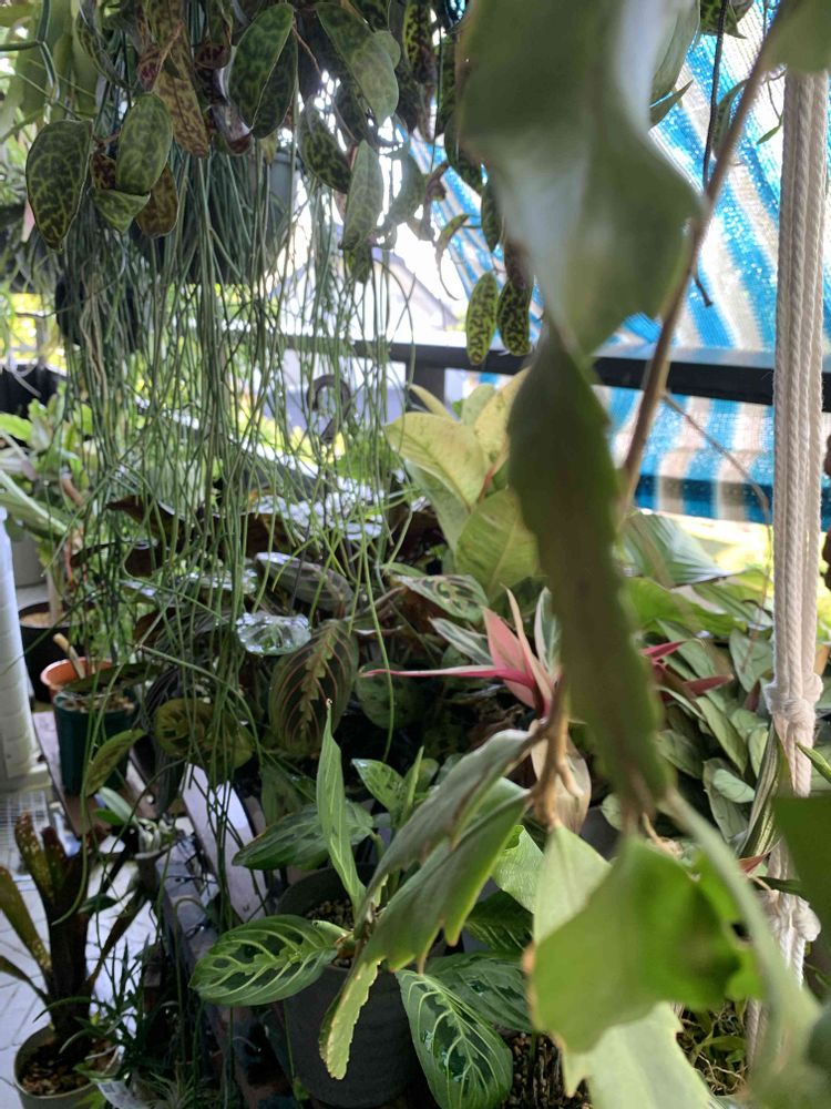 カラテアさんとかお家の中で冬場は結構葉っぱ痛めて、マランタもションボリしてたけど、外で密集させてると管理が楽チンなんです、上からダバダバ水をかけてズボラな私にはピッタリ🤣