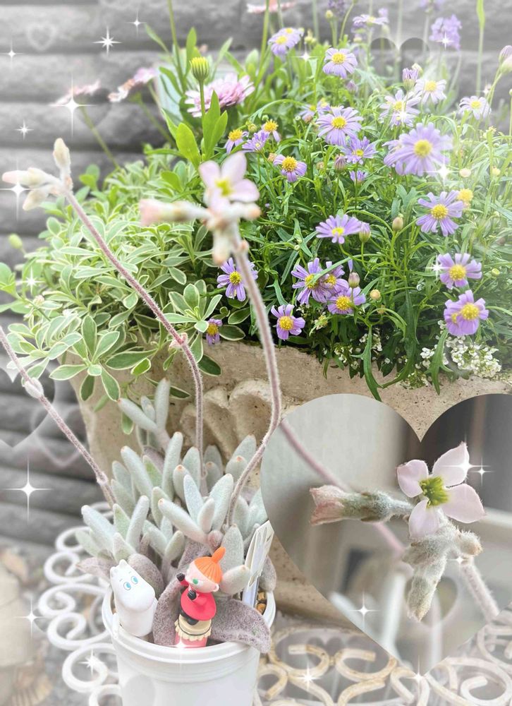 白兎耳のお花 やさしいピンクでかわいいですよね❣️多肉のお花には珍しい色で私もつい咲かせたくなっちゃいました(˶ᐢᗜᐢ˶)ブラキカムのお花もやさしい紫で全体的にほんわかpicでステキです💕