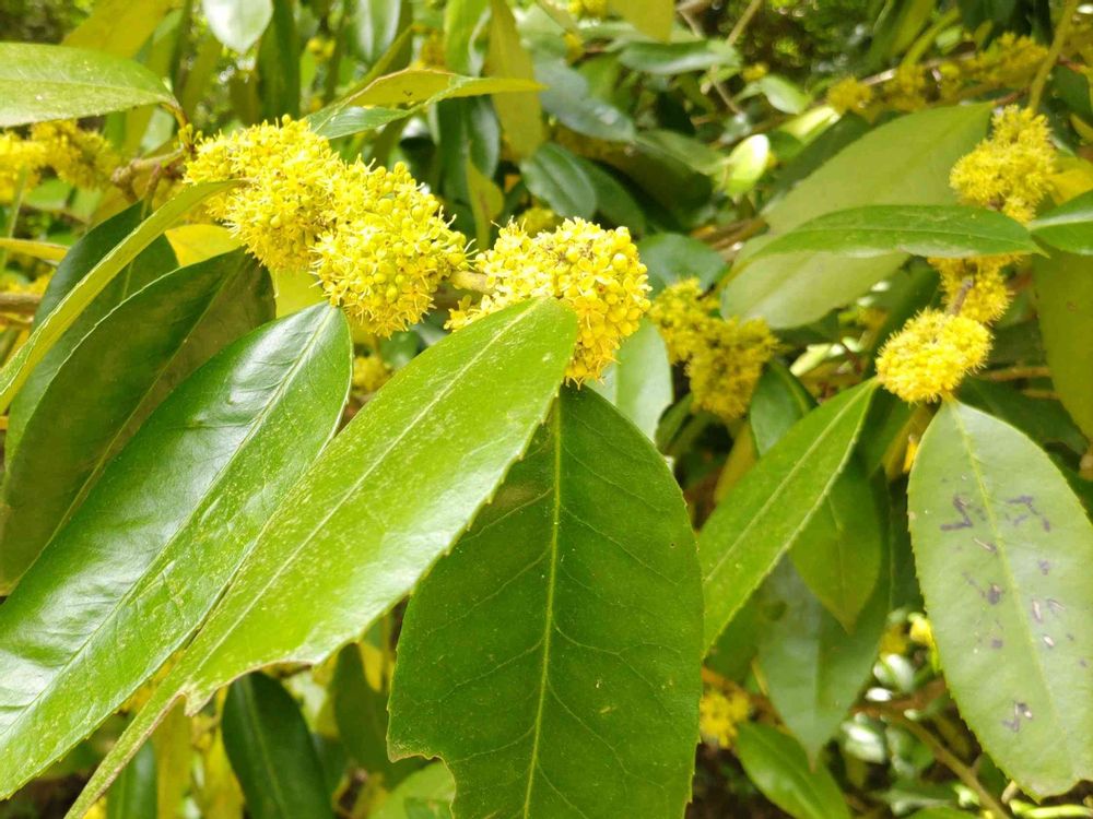 タラヨウ(葉書の木) 黄色いお花が咲いていました。葉っぱを硬い棒などで傷つけるとその跡が黒く残る、(右の方の葉) 葉書の始まりと云われています✉️