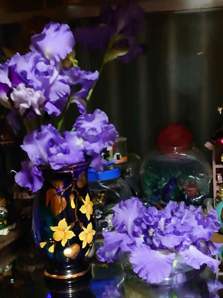 強風対策で実家の庭と畑からカットしてきたジャーマンアイリスとミヤコワスレ。