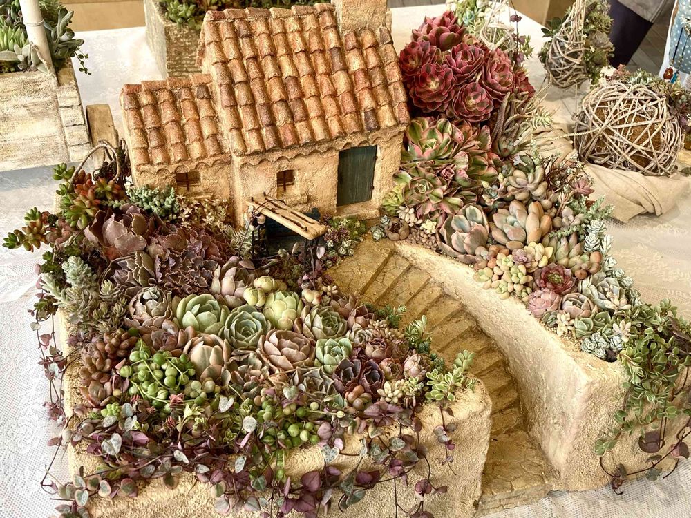 モルタルで作られた家と鉢の、ジオラマ寄せ植え。
