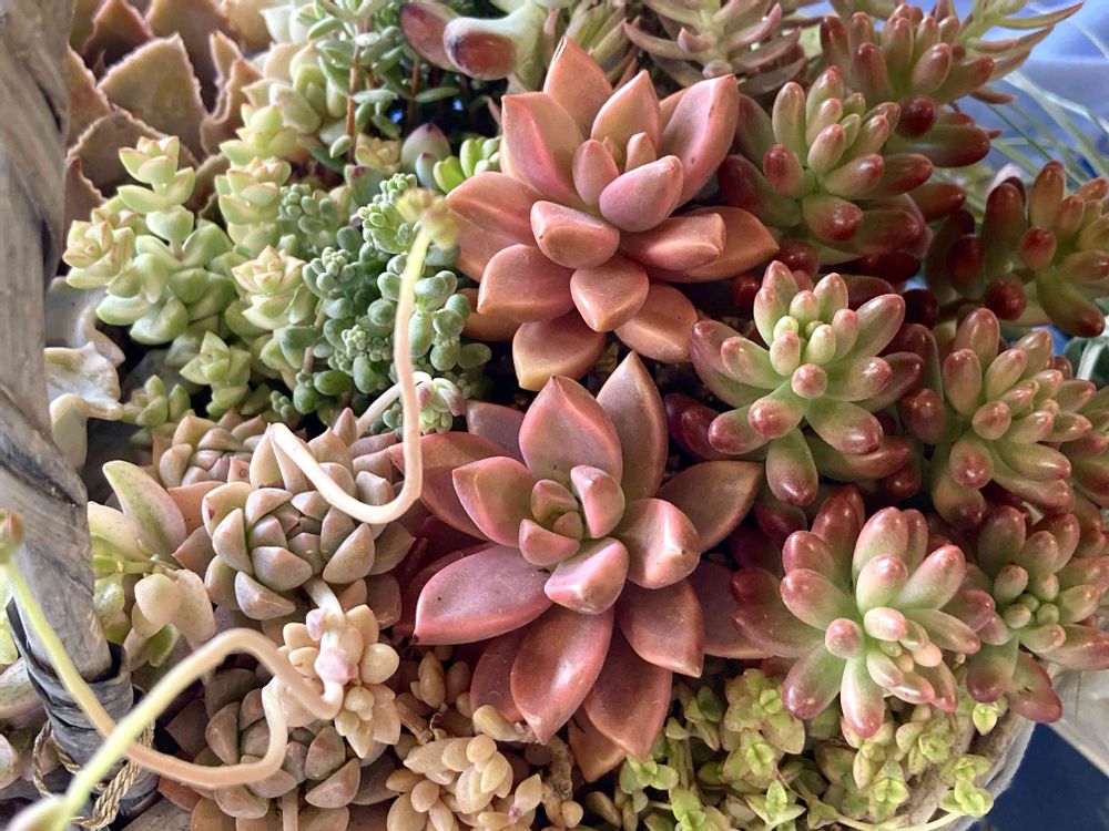 繊細な色の多肉を集めた素敵な寄せ植えです~。