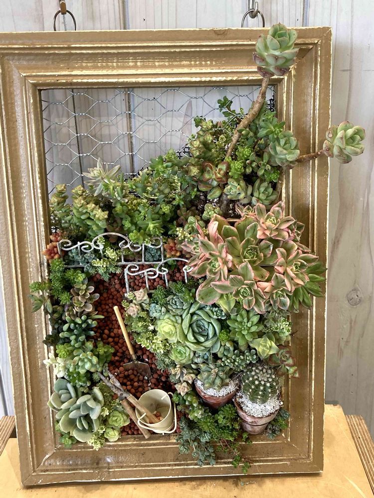 みなさん額縁の中に寄せ植えをしているのですが、これはジオラマ風で、額の後ろにも「背景」として多肉を植えているユニークな作品でした。