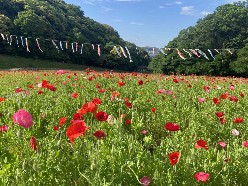 山間に広がるポピーの草原に、戦ぐ鯉のぼりたちも嬉しそうですね。