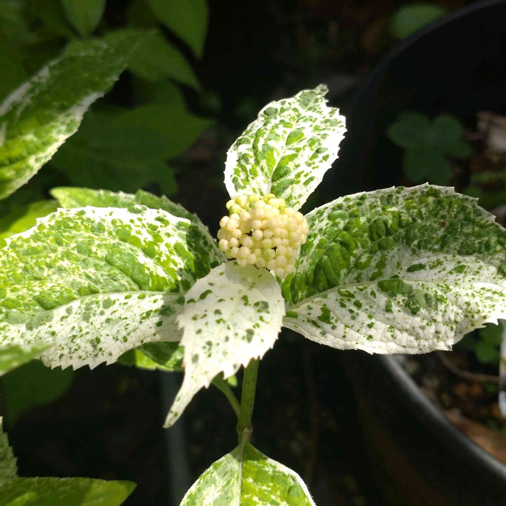 早速、前川会長から頂いた斑入りのヤマアジサイ。「あぁ石神峠」蕾も美しい。