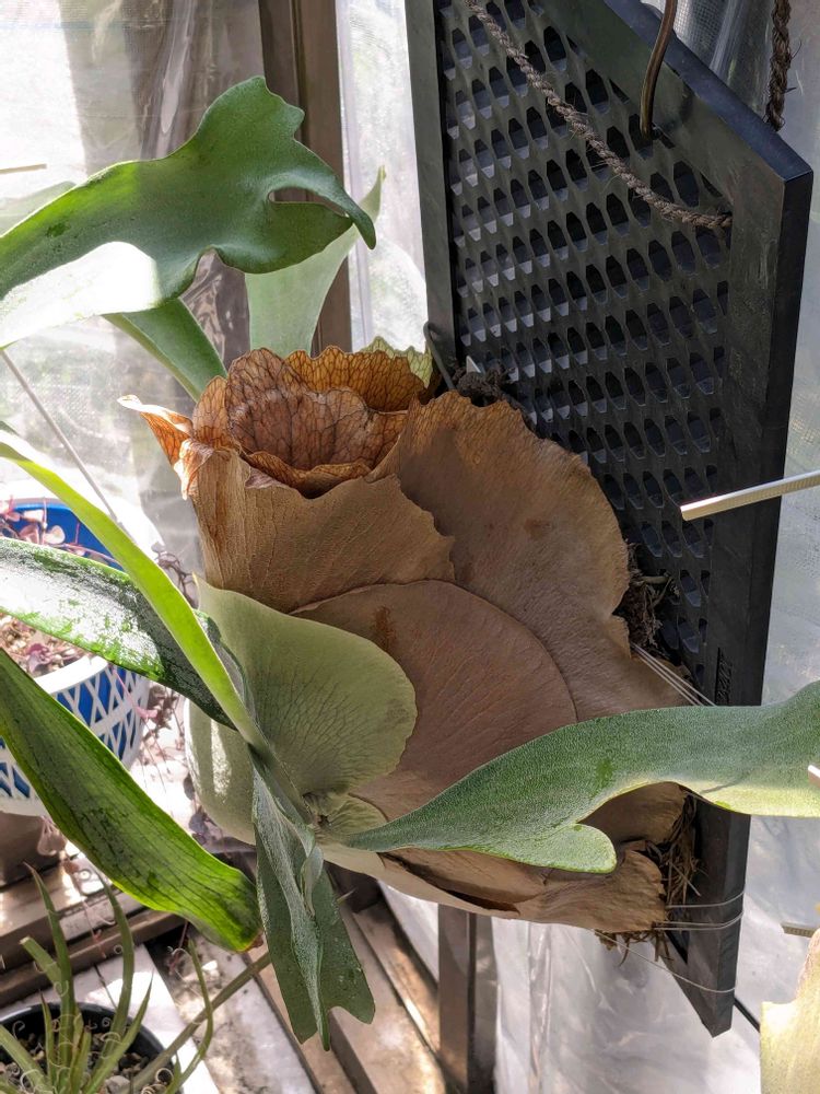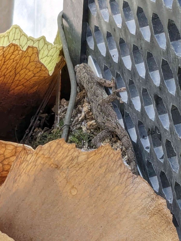 今朝、ベランダで通年屋外放置管理してるビフルカツムに水やりしたら貯水葉に隠れてたヤモリが驚いて飛び出してきた。御神木に住む家の守り神。驚かせてごめんなー🦎