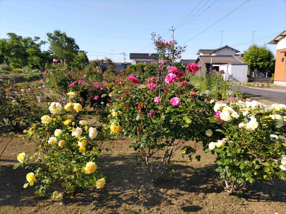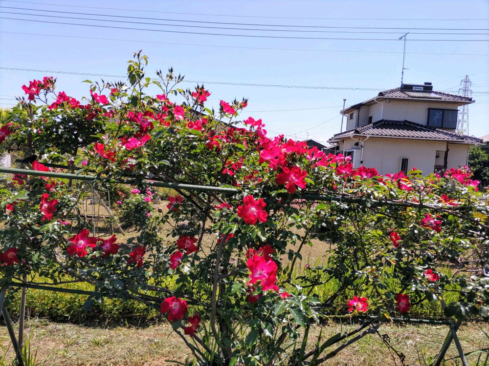 畑の所にも赤のつるバラ、ガ―デン仲間の畑の青い星型の花