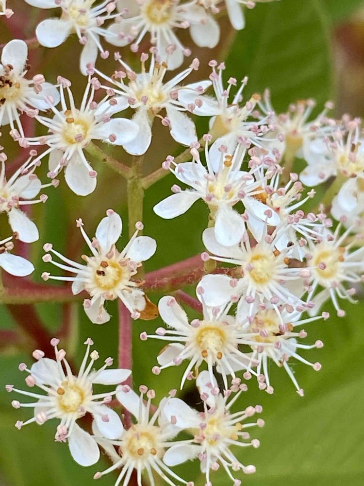 生垣のあちこちに、白くふんわりした花の塊が見られます。
