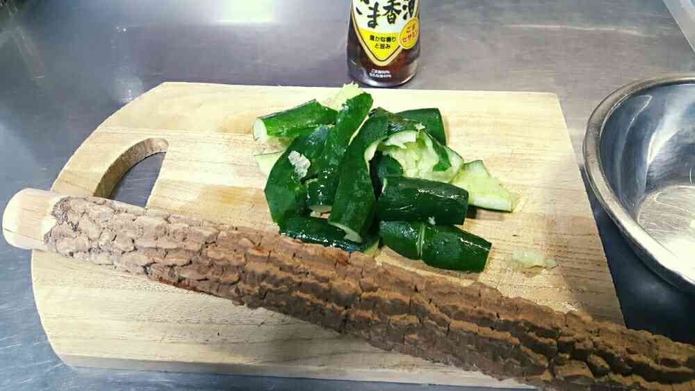叩き割ったキュウリ2本に醤油とごま油と酢を大さじ1、豆板醤を小さじ1、すりおろし生姜適当のたれに混ぜて15分寝かせたら出来上がり。