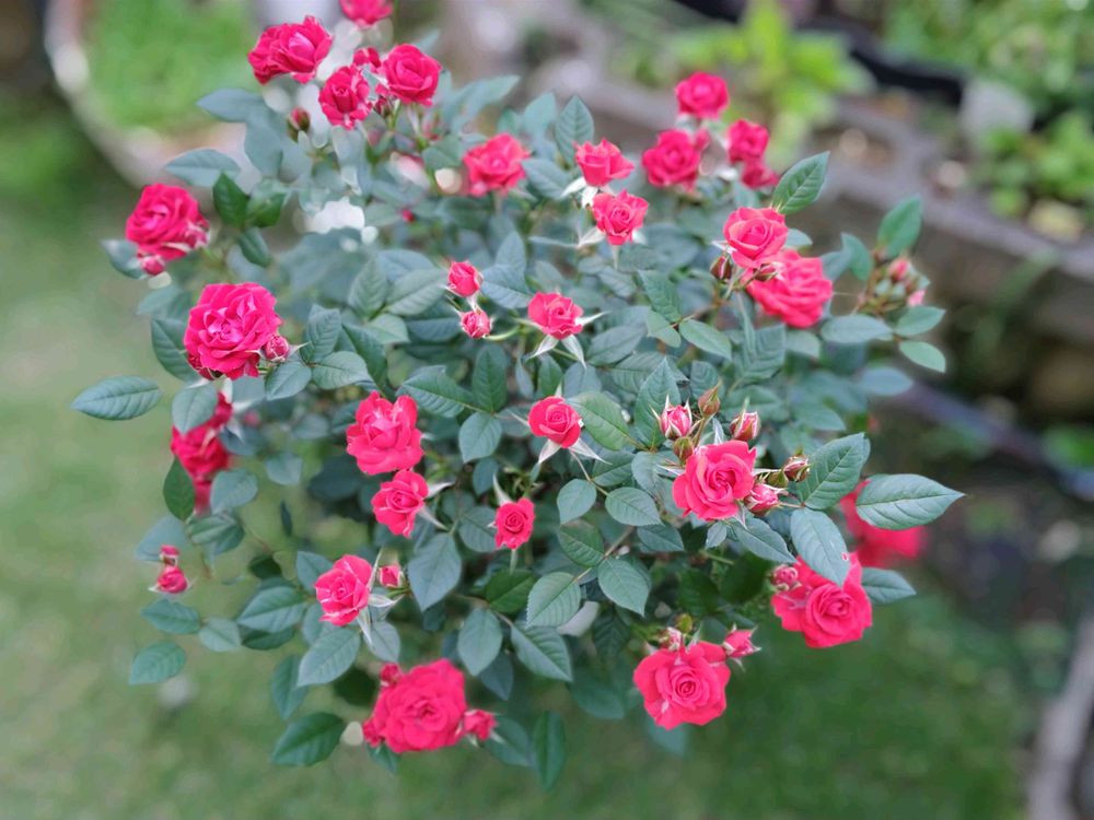 ミニバラだし大きな鉢よ大中小の中位の鉢………、にしました。芽が外向きのを探しそこをカット、してました。 で〜 このよぅに見事に咲いてくれました。 嬉しいです
