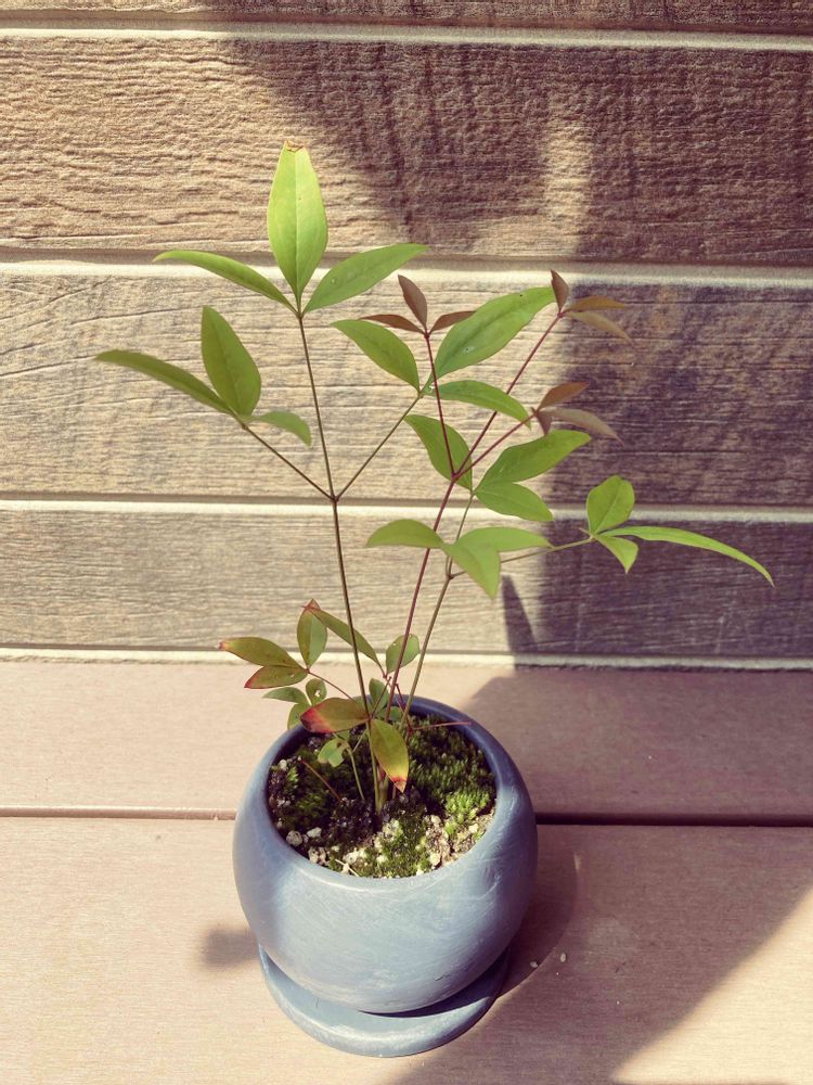 お隣さんの南天の実がうちの庭でいくつも発芽していたので盆栽風に鉢上げしてみました
