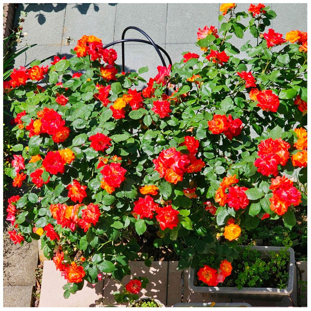 バラの触れ太鼓は、濃いオレンジと黄色の花色なんで、うちの春風の咲き初めと似てます🧡💛
