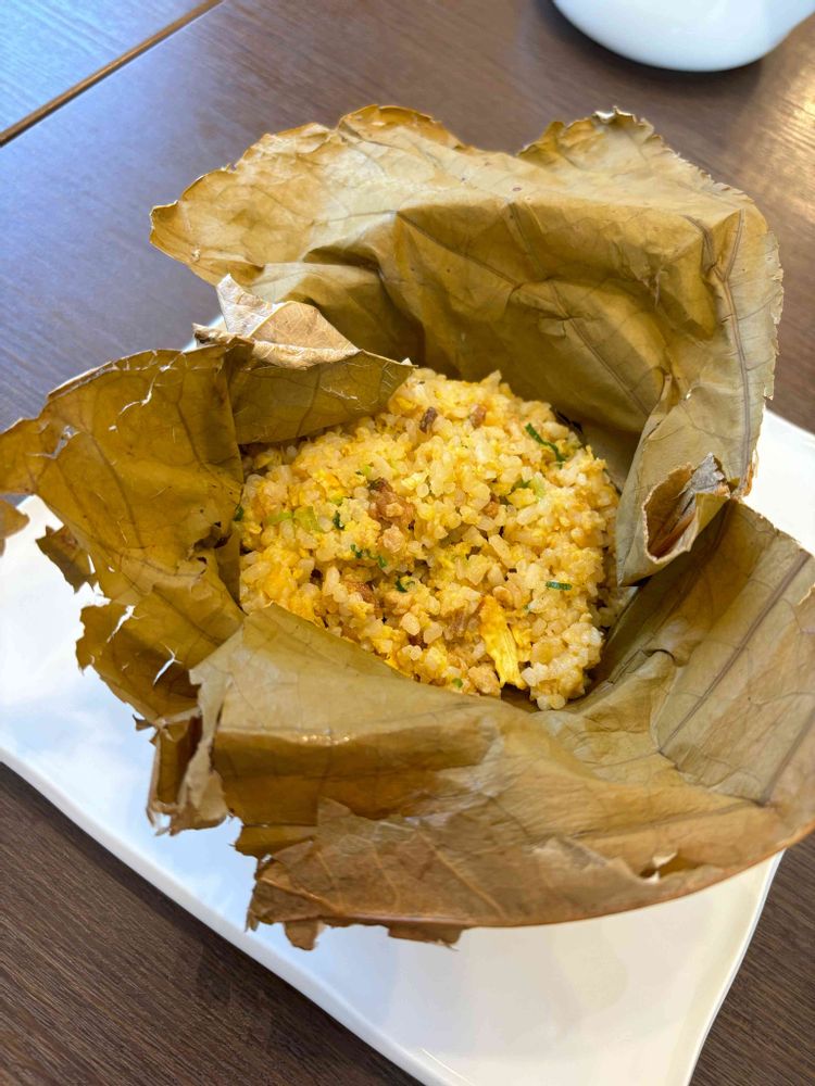 蒸し炒飯、蓮の葉で包まれてるところが、目から美味しさ倍増!