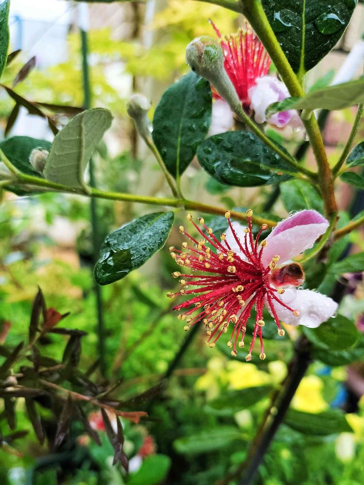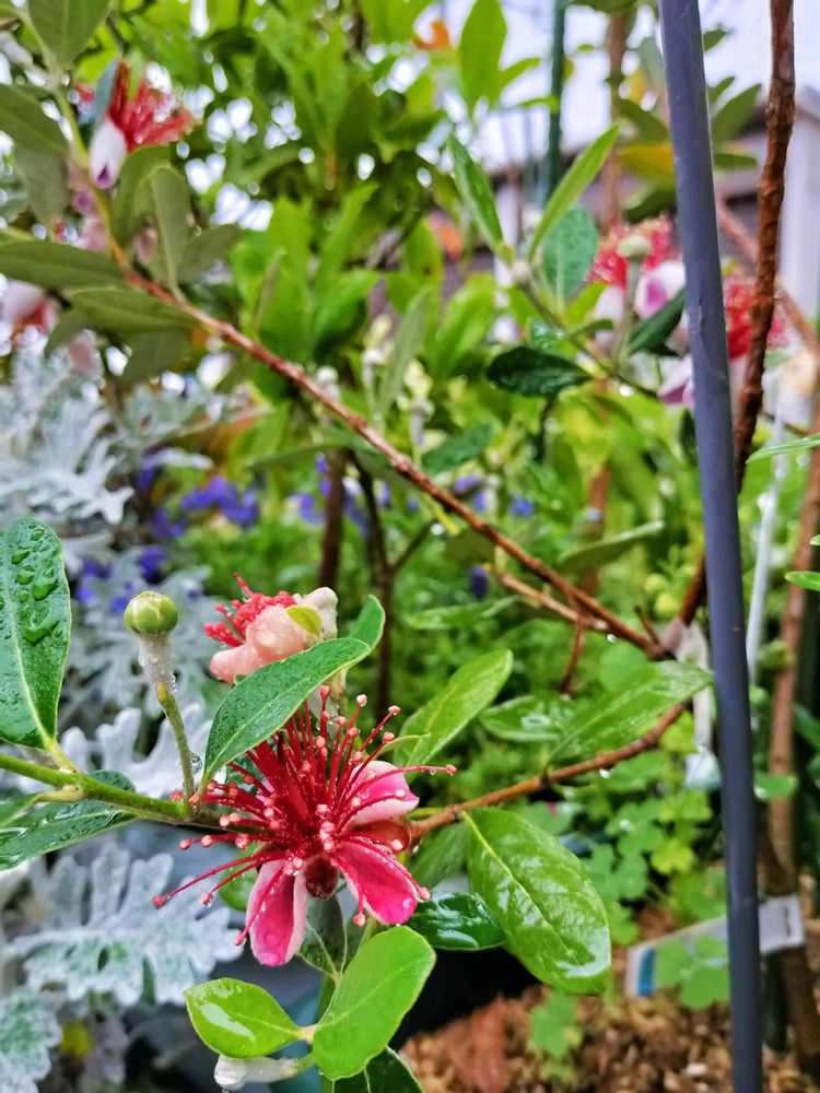 鉢植えフェイジョアの花が数日前からたくさん咲いてきました。これは多分1才性のユニーク(小型)だったかと思います。他にアポロ(大型)とジェミニ(小型)も地植えしていますが、ジェミニは場所が良くなかったので植え替え予定です。アポロはまだ蕾です。