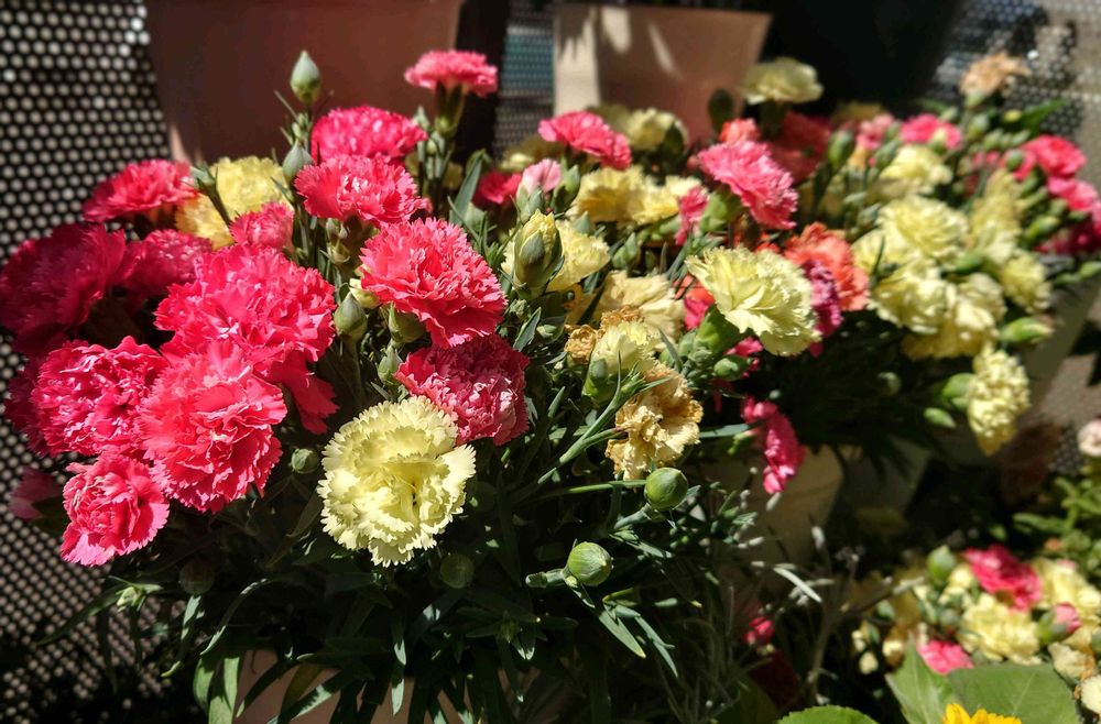 暖房使わずに自然に開花させたカーネーション。1鉢に混色で植え付けられており非常に珍しいです。花を長期間維持できるように頑張ります!