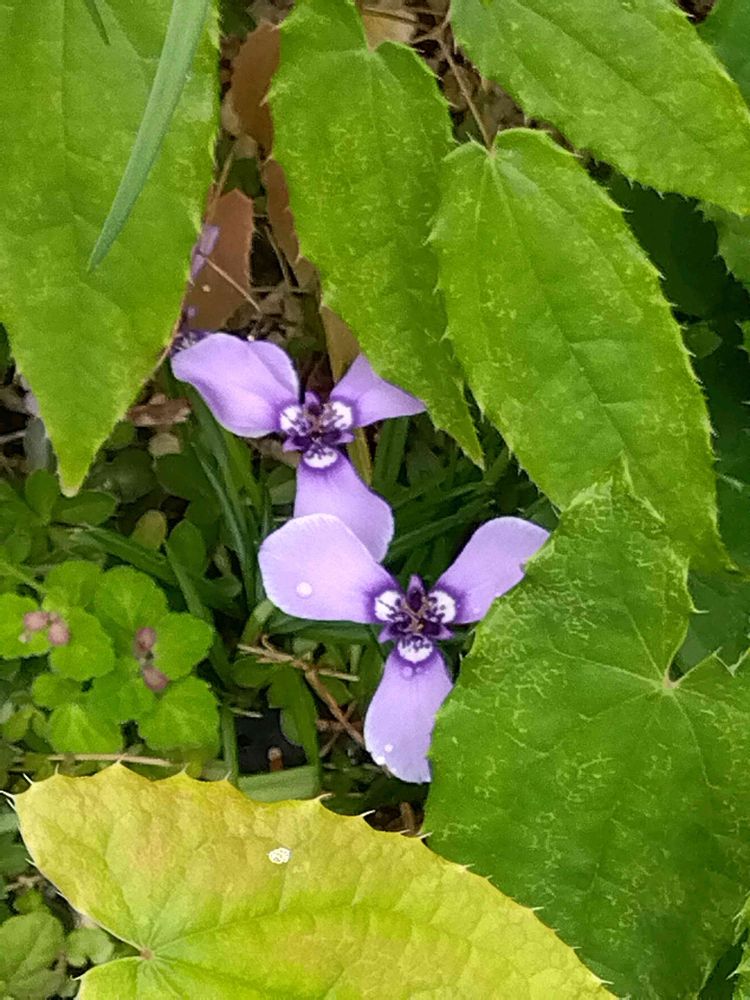 イカリソウの下でチリアヤメが隠れて咲いてる❗️1日花だから出ておいで❗️