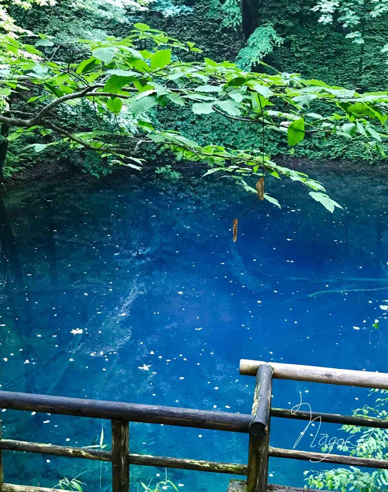 湧水のため、透き通り青い。春から夏にかけて明るい青、秋にかけて濃くなる。冬は黒く見える。十二湖で最も人気のある池である。