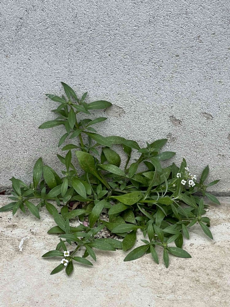 軒下の寄せ植えをどかしてみたら、またもや、こぼれタネからアリッサムが咲いてました!!