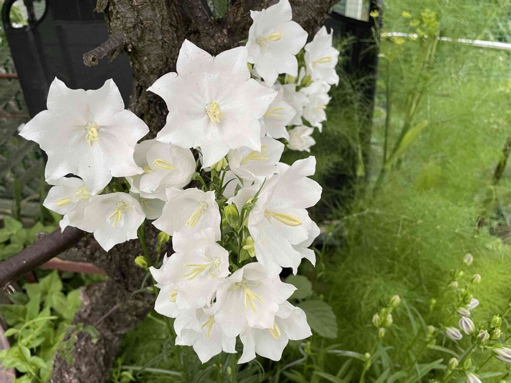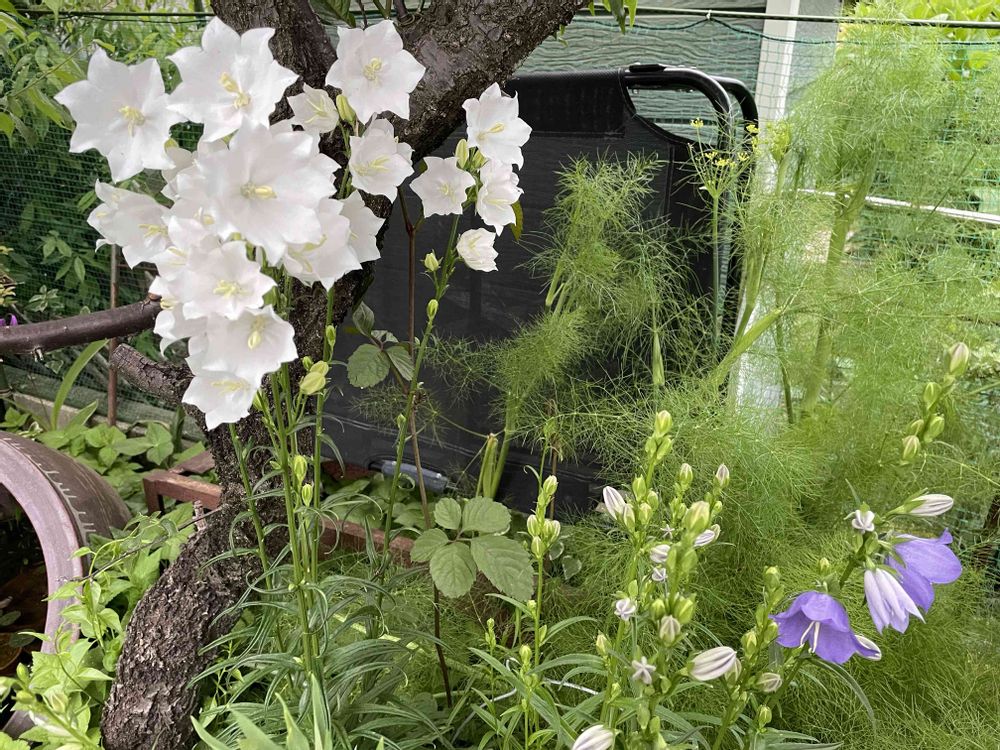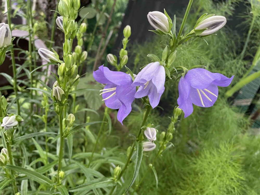 白に数日遅れて青紫の桃葉キキョウも咲き始めました☺️